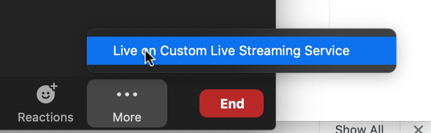 Within Zoom click More followed by Live on Custom Live Streaming Service.