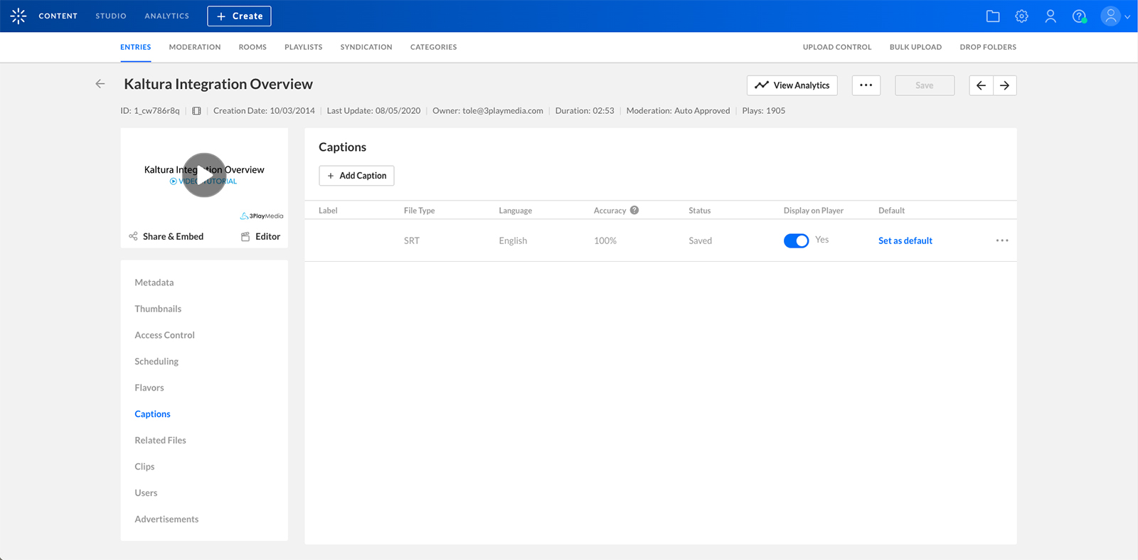 After your captions or subtitles have been processed, they are automatically sent to your Kaltura account and added to your videos. Turnaround time is specified at the time of upload and can be as quick as 2 hours. You can monitor the status of your files from your 3Play Media account.