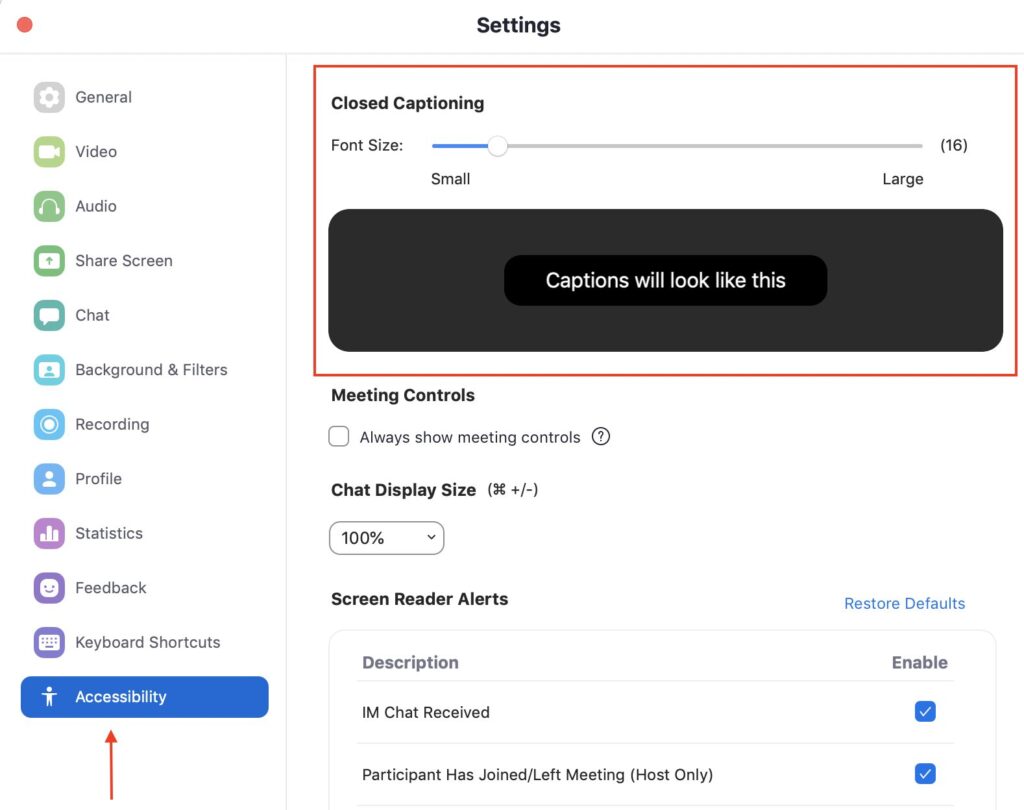 Caption size can be controlled in Zoom’s settings in the desktop client, under the “Accessibility” section. Click and drag the slider to make closed captions smaller or larger. Sizes range from 14-32 depending on your preference.