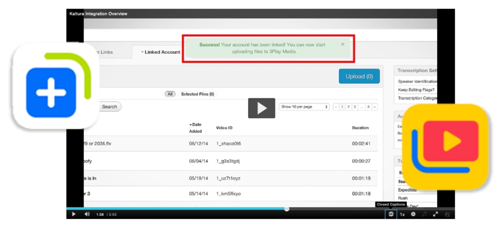 3Play Media’s round trip integration with Kaltura provides an automated workflow for captioning, subtitling, and transcription. Your video files can be transferred directly from Kaltura to your 3Play Media account for processing.